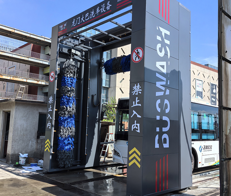 鐵士大型移動式洗車機,適用于清洗大型客車外表面的灰塵、油污及其它污漬。通過水、清洗劑及清洗刷的作用自動清洗車輛的車頭、兩側、車尾及車頂,洗車機由移動式刷洗系統、電控系統、水供給系統、洗滌劑供給系統等組成,并可配置污水循環處理系統。當車輛至清洗區指定位置停止后,洗車機在行走軌道上運動,自動進行洗滌劑噴灑,車頭、兩側、車尾及車頂的刷洗和沖洗工作,清洗后車體外表面無灰塵、泥土和其它附著物。
